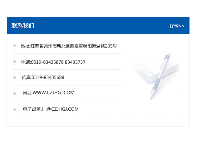 地址:常州市新北區友邦商務大廈1幢16、17層  電話:0519-85101652  傳真:0519-85112595  郵編:213022  網址:www.cz-jiayue_cn.gdtqdq.com  郵箱:xiajifengaa@163.com